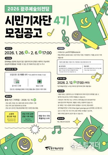 뉴스투게더 김인숙 기자 | 광주광역시 예술의전당은 전당의 다양한 공연 정보와 문화 소식을 직접 취재하고 공식 온라인 채널을 통해 알릴 ‘2026 광주예술의전당 시민기자단 4기’를 26일부터 2월6일까지 모집한다.