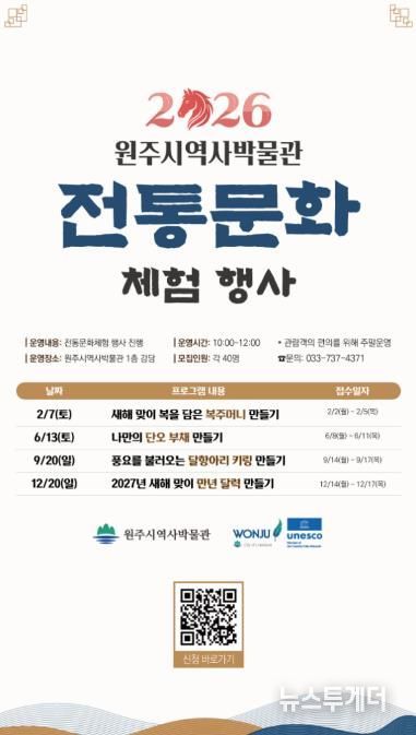 뉴스투게더 장영주 기자 | 원주시역사박물관은 새해를 맞아 ‘2026 전통문화 체험 행사’를 운영한다.