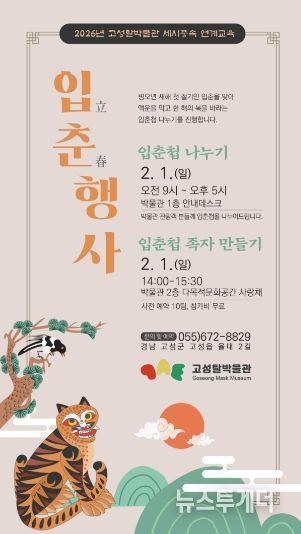 고성탈박물관 관계자는 “새해를 맞아 건강하고 행복한 한 해를 보내길 바라는 전통 세시풍속을 함께 나누기 위해 행사를 열게 됐다”라며, “이번에 전면 리모델링을 한 박물관도 구경하고 입춘첩도 만들어보는 가족 프로그램에도 많은 참여를 바란다”라고 밝혔다.