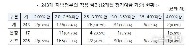 전국 243개 지방정부의 금고 이자율을 조사한 결과, 12개월 이상 정기예금 금리는 전국 평균 2.53%(공개 이자율 기준)로 집계됐다.