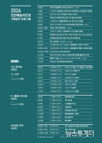 2026년 시즌의 시작은 최근 열린 천안예술의전당 신년음악회에서 국립심포니오케스트라와 홍석원 지휘 아래 첼리스트 문태국이 웅장한 무대로 알렸으며, 이후 △3월, 화이트데이 콘서트 ‘차이콥스키 피아노 트리오’·리투아니아 체임버오케스트라 with 첼리스트 홍진호 △4월, 스프링콘서트 ‘고잉홈프로젝트 with 피아니스트 손열음’ △5월, 뮤지컬 ‘어쩌면 해피엔딩’ △6월, 바이올리니스트 대니 구 데뷔 10주년 리사이틀 ‘The Journey Begins’·천안예술의전당 페스티벌 오케스트라 with 지휘 홍석원이 이어진다.