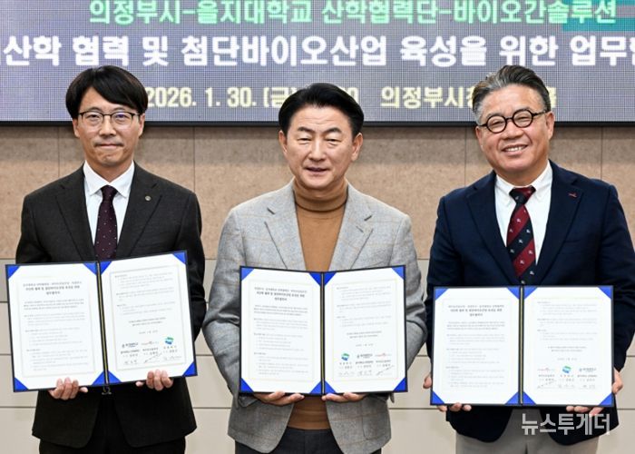 의정부시는 1월 30일 시청 회룡홀에서 을지대학교 산학협력단(단장 김인식), ㈜바이오간솔루션(대표 송명석)과 ‘지산학 협력 및 첨단 바이오산업 육성을 위한 업무협약’을 체결했다.