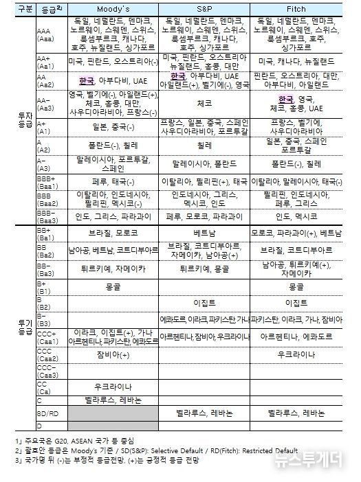 뉴스투게더 김성연 기자 | 국제 신용평가사 피치는 1.30일 한국의 국가신용등급 및 전망을 ‘AA-, 안정적’으로 유지한다고 발표했다. 아울러, 한국의 GDP 성장률이 강한 민간 소비 등으로 작년 1.0%에서 올해 2.0%로 회복될 것이라고 전망했으며, 특히 반도체 수출에 힘입어 순수출이 기조적인 성장 동력으로 계속 역할을 할 것이라고 보았다. 다만, 상호 관세 등 미국과의 통상 이슈는 여전히 리스크 요인으로 남아있다고 언급했다.