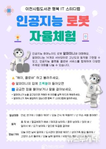 뉴스투게더 김인숙 기자 | 이천시 시립도서관은 시민들이 인공지능 기술을 일상 속에서 자연스럽게 체험할 수 있도록 인공지능 로봇 자율체험을 2월부터 10월 중순까지 운영한다고 밝혔다.