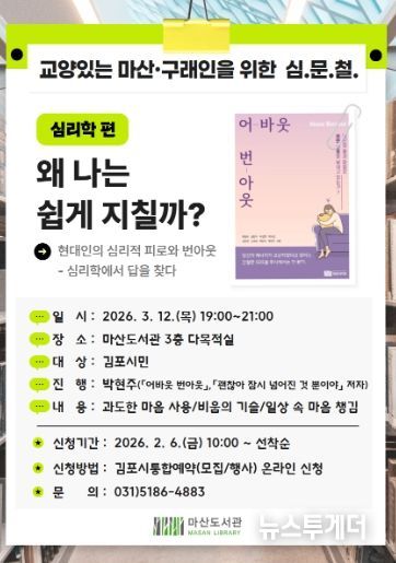뉴스투게더 김인숙 기자 | 김포시 마산도서관은 심리적 피로와 번아웃을 주제로 한 인문교양 강연 '왜 나는 쉽게 지칠까?'를 오는 3월 12일 오후 7시부터 9시까지 마산도서관 3층 다목적실에서 운영한다.