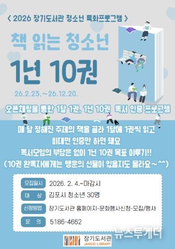 뉴스투게더 김인숙 기자 | 김포시 장기도서관은 청소년의 자발적인 독서 습관 형성을 위해 청소년 특화프로그램 ‘책 읽는 청소년 1년 10권’을 오는 2월 23일부터 연말까지 운영한다.
