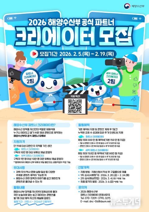 뉴스투게더 김태훈 기자 | 해양수산부는 2026년 한 해 동안 해양수산 정책을 국민 눈높이에 맞춰 쉽고 재미있게 전달해 줄 ‘2026 해양수산부 공식 영상 협력 제작자’를 2월 5일부터 2월 19일까지 모집한다고 밝혔다.