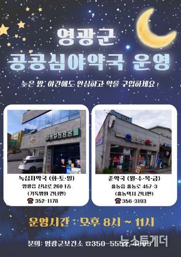 뉴스투게더 김인숙 기자 | 영광군은 오는 2월 9일부터 공공심야약국 2개소를 지정하여 매일 오후 8시부터 11시까지 운영한다고 밝혔다.