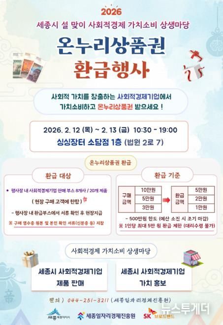 뉴스투게더 김인숙 기자 | 세종일자리경제진흥원이 설 명절 소비 대목을 맞아 오는 2월 12일부터 13일까지 양일간 싱싱장터 소담점(1층)에서 ‘2026년 설 맞이 사회적경제 가치소비 상생마당’을 운영한다.