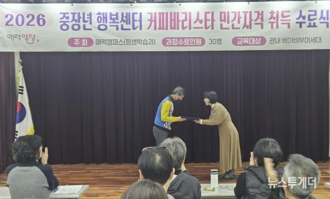 뉴스투게더 김인숙 기자 | 양평군은 지난 11일 군민을 대상으로 운영한 ‘2026년 양평군 커피바리스타 신규 양성과정’을 3주간의 교육 일정을 마무리하고 수료식을 개최했다고 밝혔다. 이번 과정은 관내 베이비부머 세대의 역량 강화를 통해 사회 공헌과 재취업 기회를 제공하기 위해 기획·운영됐다.
