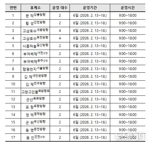 아울러 연휴 기간 중 이용자 불편을 최소화하기 위해 전화상담 창구(☏ 1661-9408) 등 비상연락체계가 운영된다.
