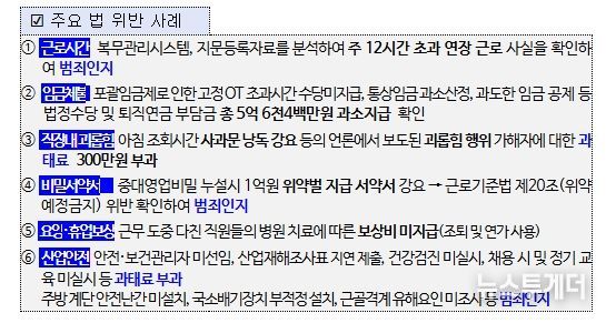 이와 함께 연장·야간·휴일근로 수당 등 임금 미지급 5억 6천4백만원에 대해서도 시정지시했다.