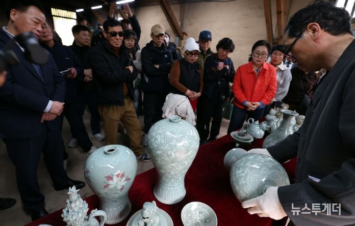 지난 22일 강진군 대구면 고려청자박물관 제2호가마에서 화목가마 요출행사가 열린 가운데 옛 전통방식 그대로 소나무 장작을 이용해 48시간 동안 구워낸 청자를 꺼내고 있다.