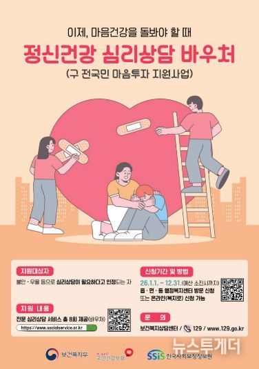 이 사업은 올해부터 기존 ‘전국민 마음투자 지원사업’에서 사업명을 변경했으며, 정신건강복지센터·자살예방센터 등록회원은 별도 검사 절차 없이 등록증명서만 소지하면 서비스를 이용할 수 있도록 해 시민 편의성을 높였다.