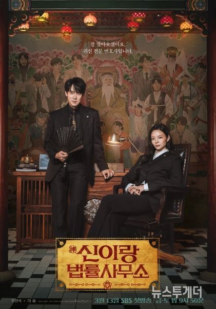 앞서 공개된 티저 포스터에서는 부적이 가득 붙은 벽면과 향로의 연기가 자욱한 옥천빌딩 501호의 ‘신이랑 법률사무소’가 “보이지 않는 진실을 변호합니다”라는 문구를 내세우며 기묘한 세계관의 시작을 알렸다. 그리고 이번 메인 포스터에서는 그 수상한 공간이 보다 선명하게 위용을 드러낸다. 고풍스러운 법률사무소 내부, 그 중심에 자리한 변호사 신이랑(유연석)과 한나현(이솜)의 뒷 배경에 전통 민화풍으로 그려진 신적 존재들과 망자가 차지하고 있는 것. 이곳이 단순한 로펌이 아닌, 보이지 않는 세계와 연결된 장소임을 직관적으로 보여주는 대목이다.