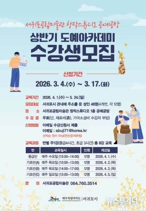 뉴스투게더 김인숙 기자 | 서귀포공립미술관은 지역주민의 여가 선용의 폭을 넓히고 도자기 체험의 기회 확대를 위해 2026년 상반기 공예공방 도예아카데미를 운영한다.