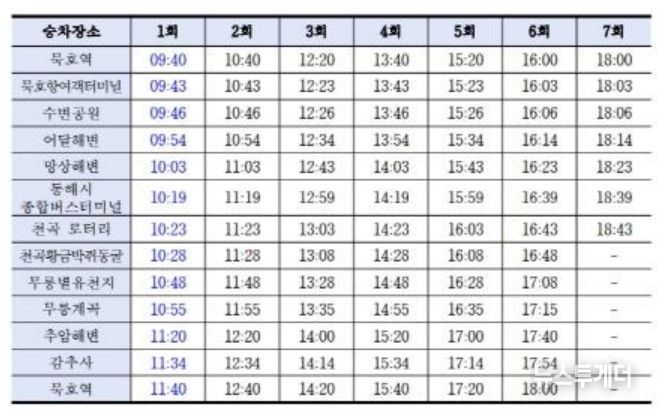 이에 따라 3월 7일부터는 묵호역 기준 오전 9시 40분에 1회차 운행이 시작되며, 수변공원, 망상해변, 무릉별유천지 등 주요 거점 정류장의 도착 시간도 10분씩 빨라진다.