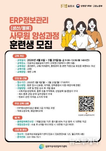 뉴스투게더 이현진 기자 | 김포여성새로일하기센터는 지역 산업 수요에 부합하는 전문 인력 양성과 경력보유 여성의 안정적인 취업 지원을 위해 '전사적 자원관리(ERP) 생산·물류 사무원 양성 과정' 훈련생을 모집한다.