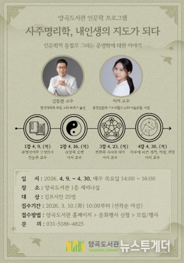 뉴스투게더 김인숙 기자 | 김포시 양곡도서관은 오는 4월 9일부터 4월 30일까지 매주 목요일, 인문학 강좌 '사주명리학, 내 인생의 지도가 되다'를 운영한다.