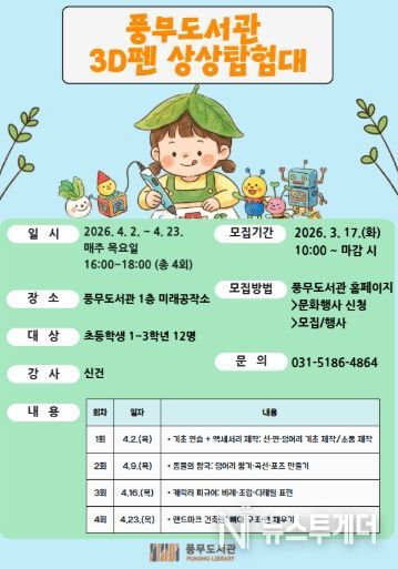 뉴스투게더 김인숙 기자 | 김포시 풍무도서관은 초등학생 1~3학년을 대상으로 ‘3차원 펜 상상탐험대’를 오는 4월 2일부터 4월 23일까지 매주 목요일 오후 4시부터 6시까지 총 4회에 걸쳐 운영한다.