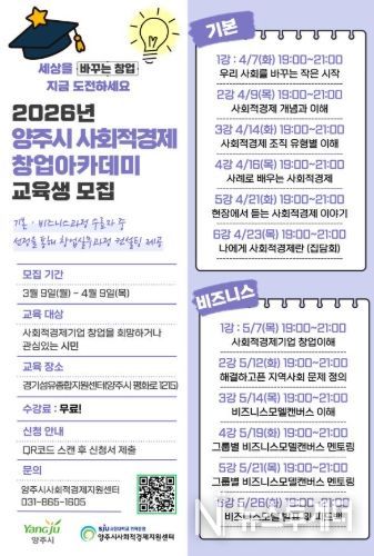 뉴스투게더 이현진 기자 | 양주시와 양주시사회적경제지원센터가 지역 내 사회적경제 인식을 확산하고, 사회적경제 교육을 통한 예비 창업가ㆍ사회적경제 분야 인력양성을 하기 위해 ‘2026년 양주시 사회적경제 창업아카데미 기본ㆍ비즈니스 과정’ 교육생을 오는 4월 9일까지 모집한다.