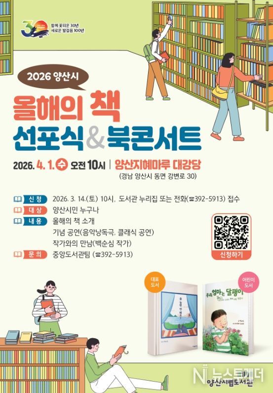 뉴스투게더 김인숙 기자 | 양산시립도서관은 오는 4월 1일 수요일 오전 10시, 지혜마루 대강당에서‘2026년 올해의 책 선포식 및 북콘서트’를 개최한다.