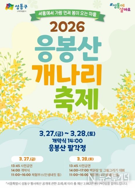 뉴스투게더 김인숙 기자 | 서울 성동구는 오는 3월 27일부터 28일까지 이틀간 봄의 기운을 가득 품은 응봉산에서 ‘2026년 응봉산 개나리 축제’를 개최한다.