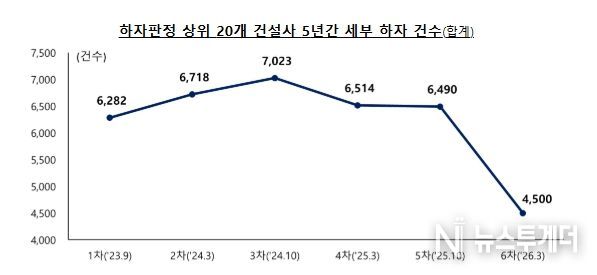 최근 5년(’21.3~’26.2) 누계 기준으로는, (주)순영종합건설(383건, 세부 하자수 기준), (주)대명종합건설(318건), 에스엠상선(주)(311건), 제일건설(주)(299건), (주)대우건설(293건) 순으로, 대형 건설사의 세부 하자 수 감소에 따라 그간 1차 발표(’23.9)부터 유사했던 상위 건설사 순위가 금번 발표 시 크게 변동된 것으로 나타났다.