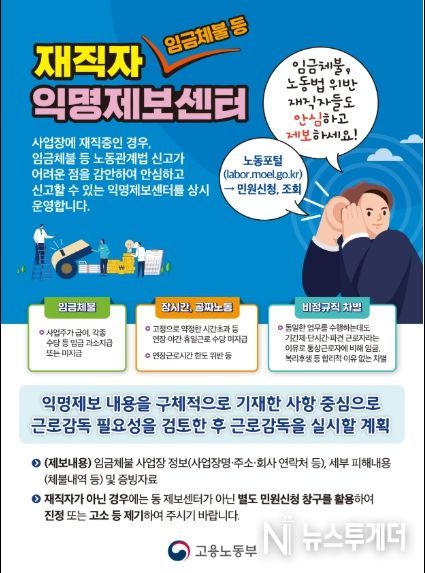 뉴스투게더 김성연 기자 | 고용노동부는 ‘숨어있는 체불’을 선제적으로 청산하고 포괄임금 오남용으로 인한 “공짜 노동”을 근절하기 위해 「재직자 익명제보 사업장 근로감독」을 4월 22일부터 약 2개월간 진행한다고 밝혔다.