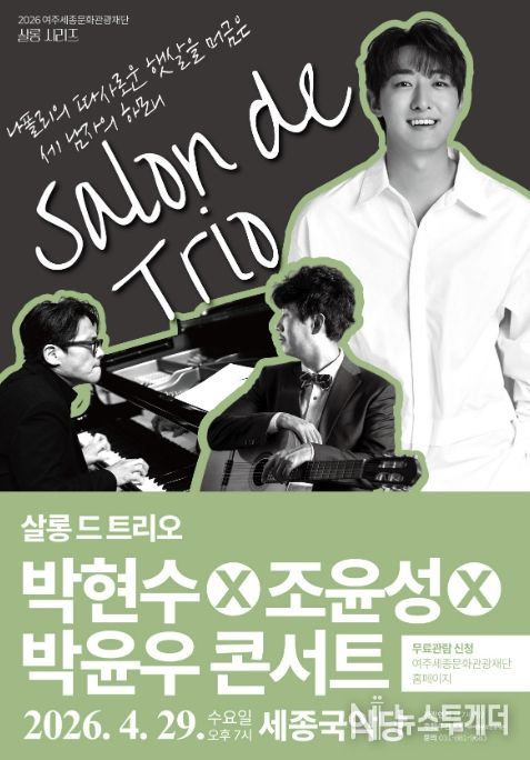 뉴스투게더 김인숙 기자 | 여주세종문화관광재단이 오는 29일, 문화가 있는 날을 맞아 2026년 특별기획 살롱 시리즈의 세 번째 무대 '살롱 드 트리오 박현수X조윤성X박윤우 콘서트'를 세종국악당에서 개최한다.