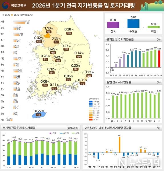 뉴스투게더 김성연 기자 | 국토교통부와 한국부동산원(원장 이헌욱)은 '26년 1분기 지가변동률 및 토지거래량을 발표했다.