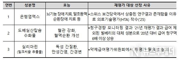 개편 평가체계에 따라 2026년도 평가 대상으로 은행엽엑스, 도베실산칼슘수화물, 실리마린(밀크씨슬 추출물) 총 3개 성분이 선정됐으며, 구체적 선정 사유는 아래와 같다.