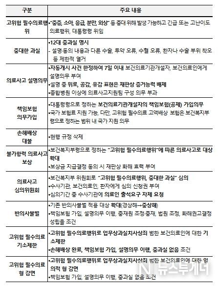 불가항력 의료사고 보상 대상을 기존 분만사고에서 ‘보건복지부령으로 정하는 고위험 필수의료행위’로 확대하여 필수의료에 대한 국가책임을 강화했다. 보상 대상인 고위험 필수의료행위의 범위·유형에 대해서는 의료계, 전문가 등과 논의하여 보건복지부령을 통해 구체화할 예정이다.