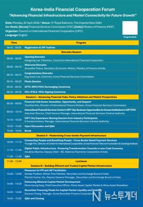 이 위원장은 4월 20일 뉴델리에서 최초로 개최된 한-인도 금융협력포럼(주최: 해외금융협력협의회, 후원: 금융위원회)에 참석했다. 이 위원장은 축사를 통해 “금융이 한국의 압축 성장을 이끈 것처럼, 금융이 인도의 새로운 도약을 위한 엔진이 될 것”이라며 양국간 금융협력의 중요성을 강조했다. 이번 포럼은 미래 성장을 위한 금융인프라 및 시장 연계성 강화(Advancing Financial Infrastructure and Market Connectivity for Future Growth)”라는 대주제 아래, ▲국경 간 결제 인프라 현대화, ▲자본시장 인프라 구축, ▲금융중심지 발전이라는 세 개의 세션으로 진행됐다.