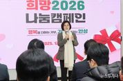 뉴스투게더 김인숙 기자 | 안성시는 12월 4일 경기 사회복지공동모금회와 함께 ‘희망 2026 나눔캠페인’ 행사를 열고, 연말연시 따뜻한 나눔 분위기 확산에 나섰다. 이날 행사에는 김보라 안성시장을 비롯하여 경기 사회복지공동모금회 김효진 사무처장 및 관계자, 그리고 지역 내 주요 기부 참여 기업인 ㈜그랜드썬기술단에스피, 한솔아이원스(주), ㈜삼양컴텍, 한일크린에너지(주), 골프클럽큐레저산업(주) 등 기업인들이 함께해 자리를 빛냈다. ‘희망 2026 나눔캠페인’은 2025년 12월 1일부터 2026년 1월 31일까지 두 달간 진행되며, 안성시의 모금 목표액은 5억 원이다. 시민과 지역 기업이 정성으로 모은 성금과 물품은 관내 어려운 이웃에게 전달될 예정이다. 행사 주요 내용으로는 캠페인 소개를 시작으로 ‘사랑의 온도탑 제막식’과 ‘명사 열매달기’ 행사가 진행됐으며, 이어 기부금(품) 전달식이 열려 본격적인 나눔캠페인의 출발을 알렸다. 김보라 안성시장은 “이번 ‘희망 2026 나눔캠페인’을 통해 따뜻한 나눔의 가치가 지역사회 전반에 퍼지길 바란다”며 “시민 모두가 동참해 어려운 이웃과 온정을 나누는 시