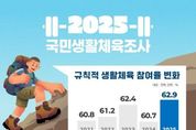 뉴스투게더 윤종우 기자 | 문화체육관광부는 만 10세 이상인 국민 9천 명을 대상으로 시행한 ‘2025년 국민생활체육조사’ 결과를 발표했다. 2025년 생활체육 참여율(주 1회, 30분 이상)은 62.9%로, 전년 대비 2.2%포인트(p) 상승했다. 특히 주 2회 이상 참여율은 52.2%로 2.7%포인트(p) 증가했다. 연령대별로는 20대부터 60대까지의 참여율은 65% 내외로 비교적 고르게 나타났으나, 10대(43.2%)와 70대 이상(59.5%)은 다른 연령대에 비해 낮은 수준을 보였다. 주요 참여 종목은 걷기(40.5%), 보디빌딩(17.5%), 등산(17.1%) 순으로 나타났다. 이 중 등산은 전년 대비 5.0%포인트(p) 증가해 참여 비중의 증가 폭이 가장 컸다. 주로 참여하는 체육활동(1+2+3순위) 1회 평균 참여 시간은 ‘1시간~1시간 30분 미만’이라고 응답한 비율이 67.3%로 가장 높았다. 최근 1년간 체육활동 참여 기간이 ‘9개월 이상’이라고 응답한 비율은 91.4%였다. 규칙적 참여자의 평균 참여 기간은 14개월로, 전년(11개월) 대비 증가한 것으로 나타났다. 체육활동 장소