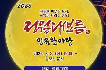 뉴스투게더 김인숙 기자 | 청도군은 오는 3월 3일 정월대보름을 맞아 청도천 둔치에서 '2026 정월대보름민속한마당'을 개최한다고 밝혔다. 이번 행사는 전국 최대 규모의 달집태우기 행사로, 높이 20m에 이르는 대형 달집을 점화하며 군민의 안녕과 풍년농사를 기원하는 청도의 대표적인 전통 민속행사다. 매년 수천 명이 찾는 이 행사는 지역 전통문화의 상징으로 자리매김하고 있다. 행사 당일 낮 12시부터는 소원문 쓰기, 민속놀이 체험, 세시음식 나누기, 농특산물 판매 등 다양한 부대행사가 운영되며, 오후에는 읍·면 풍물단이 참여하는 풍물경연대회가 펼쳐진다. 풍물경연대회는 청도군 각 읍·면을 대표하는 풍물단이 참여해 기량을 겨루는 행사로, 경상북도 무형문화재로 지정된 차산농악 으로 유명한 청도군의 수준높은 풍물단 공연이 행사의 흥과 참여 열기를 한층 끌어올릴 것으로 기대된다. 이어 '현역가왕2'에서 활약중인 초청가수 김수찬의 공연과 달맞이 의식이 진행되며, 월출 시각에 맞춰 기관·단체장과 군민이 함께 참여하는 전국 최대 규모의 달집 점화가 장관을 연출할 예정이다. 김하수 청도군수는 “병오년 새