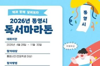 뉴스투게더 김인숙 기자 | 통영시립도서관은 지속적인 독서활동 권장을 통한 독서문화 저변 확대를 위해 오는 28일부터 11월 30일까지 '2026년 통영시 독서마라톤 대회'를 진행한다. 독서마라톤은 책 1쪽을 2m로 환산해 참가자가 책을 읽고, 독서기록일지를 작성해 사전에 설정한 코스에 따라 목표 독서량을 달성하는 범시민 독서 캠페인이다. 이번 활동은 ▲비진도(5km) ▲욕지도(10km) ▲장사도(21km) ▲소매물도(42.195km) 4개의 코스가 있으며, 소매물도 코스는 개인과 가족으로 나누어져 가족 모두가 협력해 코스를 완주할 수 있다. 또한 독서마라톤 연계 프로그램으로 경남독서한마당 선정도서를 읽고 독서기록 일지 작성 시 완주거리를 2배로 인정해주는 ▲JUMPING BOOK과 환경교육 선정도서를 읽고 감상문을 제출하면 ‘환경지킴이 인증서’와 함께 소정의 상품을 수여하는 ▲지구를 구하는 환경도서 읽기 등의 이벤트가 진행될 예정이다. 독서마라톤은 초등학생 이상 통영시립도서관 회원이면 누구나 참여 가능하며, 통영시립도서관 누리집'2026 통영시 독서마라톤 대회'페이지를 통해 대회 기간 동안 자유롭게