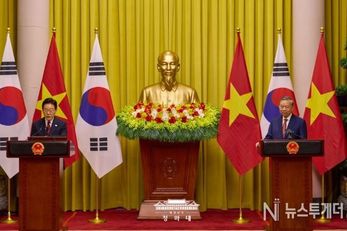 뉴스투게더 김태훈 기자 | 베트남을 국빈 방문 중인 이재명 대통령은 22일(현지시간) 오후 베트남 국가주석궁에서 또 럼 당서기장 겸 국가주석과 정상회담을 갖고, 양국 간 포괄적 전략 동반자 관계 발전 방안과 지역·국제 정세 등에 대해 심도 있게 논의했다고 이규연 청와대 홍보소통수석이 서면 브리핑했다. 또 럼 당서기장은 이 대통령의 베트남 방문을 환영하며, 본인이 지난해 한국 정부의 첫 국빈으로 방한한 데 이어, 이 대통령이 베트남의 신지도부 출범 후 베트남의 첫 국빈으로 방문한 것을 뜻깊게 생각한다고 했다. 이 대통령은 또 럼 당서기장의 환대에 사의를 표하고, 서로가 첫 국빈 접수국으로 상대국을 선택한 것은 양국이 얼마나 특별한 관계인지를 잘 보여주고 있다고 했다. 양 정상은 교역·투자를 비롯해 에너지·원전, 인프라, 과학기술, 문화·인적교류 등 미래지향적, 전략적 분야에서 협력을 한 단계 높이자는 데 의견을 같이했다. 이에 이번 정상회담을 계기로 분야별 협력 강화를 위한 총 12건의 협력 문건이 체결됐다. 교역·투자 분야에서 양 정상은 호혜적인 실질 협력을 더욱 강화해 나가기로 했다. 이와 관련,