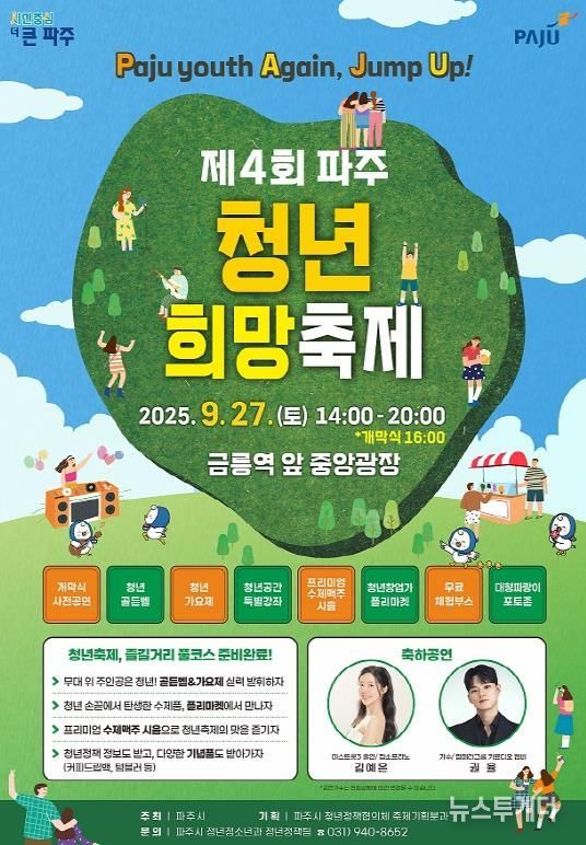 뉴스투게더 김인숙 기자 | 파주시는 청년의 날을 맞아 청년들이 함께 소통하고 공감하며 즐길 수 있는 교류의 장인 ‘제4회 파주 청년희망축제’를 오는 27일 14시부터 20시까지 금릉역 앞 중앙광장에서 개최한다.