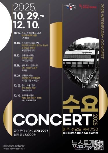 뉴스투게더 김인숙 기자 | 광주문화재단은 오는 12월 3일과 12월 10일 수요일 저녁 7시 30분, 빛고을아트스페이스 5층 소공연장에서 12월의 ‘수요콘서트’를 개최한다고 밝혔다.