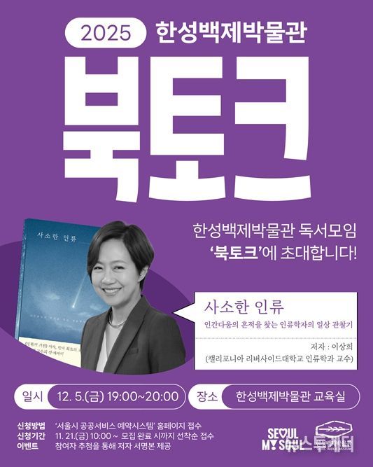 뉴스투게더 김인숙 기자 | 서울시 한성백제박물관은 올해 두 차례 운영된 역사독서모임 ‘북토크’를 12월 5일에 추가 개최한다고 밝혔다. 당초 연 2회 운영했으나 높은 시민 호응에 힘입어 추가 편성을 결정한 것이다. 이번 행사는 서울시 대표 야간문화 프로그램 ‘문화로 야금야금(夜金)’의 일환으로, 금요일 밤 박물관에서 역사학·고고학 분야 저자와 시민이 직접 소통할 수 있는 자리로 마련됐다.
