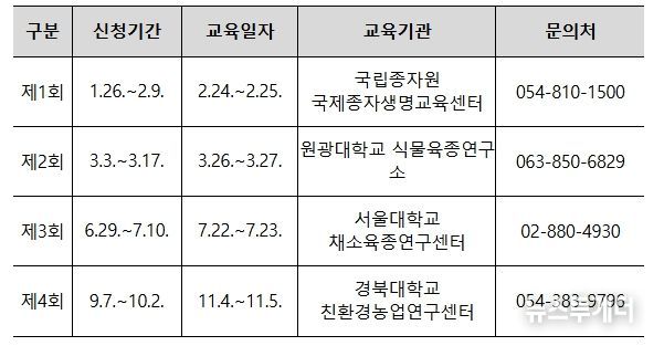 교육운영 방식은 전년도 교육 수료자들의 의견을 반영하여 집합(24일)과 온라인교육(25일)을 병행하여 운영되며 교육 신청자는 관련 세부 사항 및 일정(교육신청: 1.26~2.9)을 국제종자생명교육센터 누리집에서 확인할 수 있다.