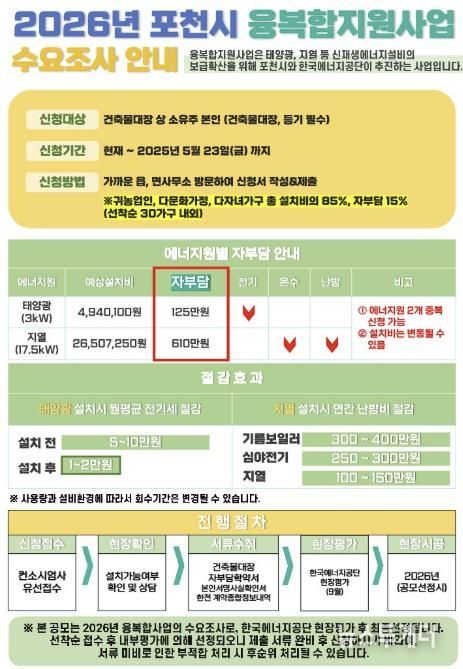 뉴스투게더 김재윤 기자 | 포천시는 오는 23일까지 산업통상자원부 주관 ‘2026년 신재생에너지 융복합지원사업’ 공모 신청을 위한 수요 조사를 한다.