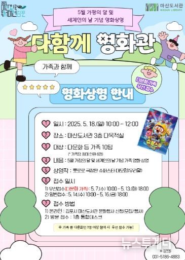 뉴스투게더 김재윤 기자 | 김포시 마산도서관은 5월 가정의 달 및 세계인의 날을 맞아 다문화 가정 등 국적과 나이에 상관없이 부모와 자녀가 함께 볼 수 있는 '다함께 영화관'을 진행한다고 밝혔다.