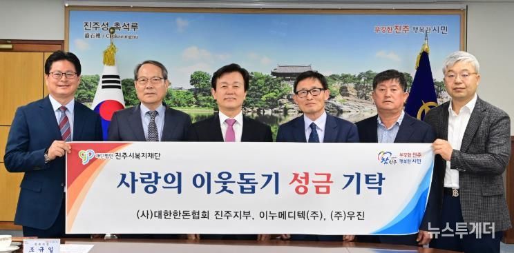 이날 기탁식에는 이누메디텍㈜(대표 이인우)에서 성금 2000만 원, (사)대한한돈협회 진주시지부에서 성금 1000만 원, ㈜우진(대표 신일섭)에서 성금 1000만 원을 전달하며 지역사회 어려움을 겪고 있는 이웃에게 따뜻한 온정을 전했다.