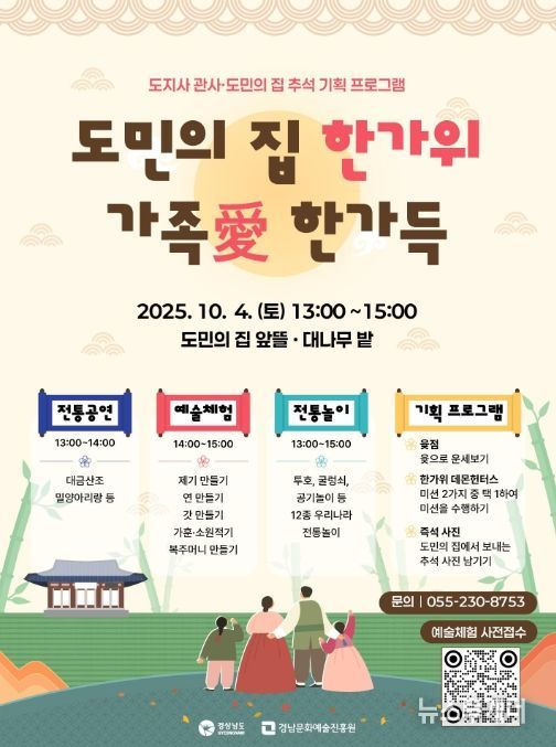조여문 경남도 문화예술과장은 “경남 도민의 집에서 온 가족이 함께 웃고 즐길 수 있는 다채로운 문화행사를 준비했다”라며, “전통공연과 예술체험을 즐기며 행복한 추석 연휴를 보내시길 바란다”라고 전했다.