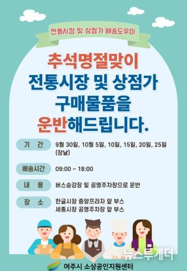 뉴스투게더 이현진 기자 | 여주시는 여주시소상공인지원센터 주관으로 다가오는 추석 명절을 맞이하여 전통시장과 상점가를 찾는 시민들의 편의를 돕고 전통시장 활성화를 위해 ‘전통시장 및 상점가 배송 도우미’ 서비스를 운영한다.