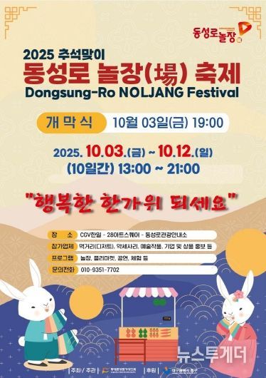 뉴스투게더 김인숙 기자 | 대구 중구는 10월 3일부터 12일까지 10일간 동성로 보행자전용도로 일원에서 ‘동성로에서 놀며 장보자!’라는 테마로 ‘2025 추석맞이 동성로 놀장(場) 축제’를 개최한다.