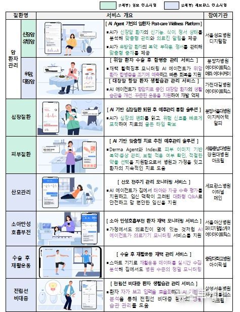 ‘의료AI 혁신 생태계 조성(닥터앤서3.0)’ 사업은 환자가 일상으로 복귀한 이후에도 주도적으로 예후를 관리할 수 있도록 AI가 돕고, 응급상황 시 의료진이 적시에 개입할 수 있도록 지원하는 서비스 개발‧실증 사업이다. 당초 ’25년도 예산 규모(23억원)에 따라 유방‧신장암, 심장질환 등 4종의 재활‧만성 질환을 선정했으며, 하반기 추경(40억원 증)을 계기로 위암‧대장암, 산모 질환 등 6종의 질환을 추가 선정하여 총 10종 질환에 특화된 AI 예후 관리 서비스를 개발한다.